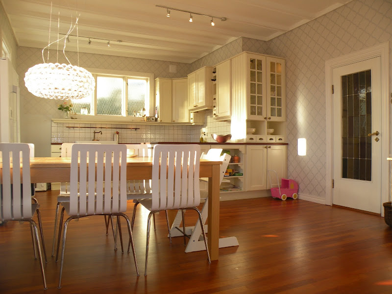 Siddisliv har pusset opp kjøkken. Mye er beholdt fra det første bildet som er fra prospektet da de kjøpte huset, men se på detaljene: særlig er tapeten herlig!